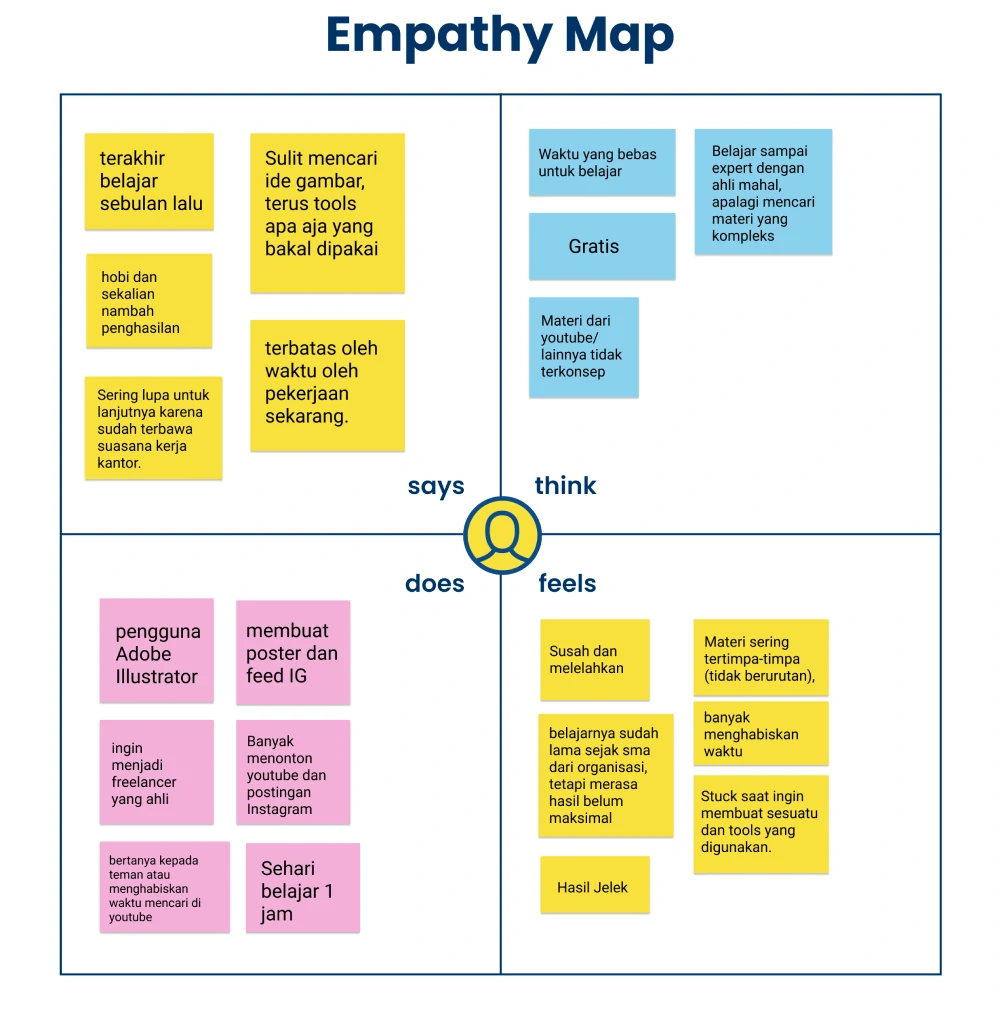 Empathy Map is obtained based on interviews with users shown in the user persona above. Empathy Map will be very useful in understanding user feelings and making us think and act as users. Then it is useful to align business strategies and value propositions with customer wants, needs, goals, and feelings.